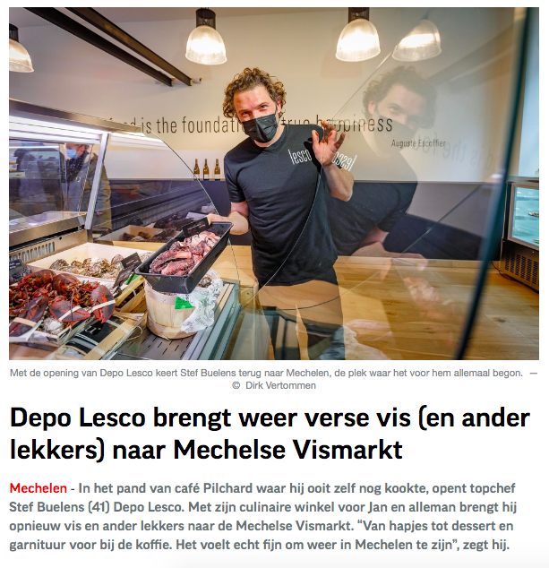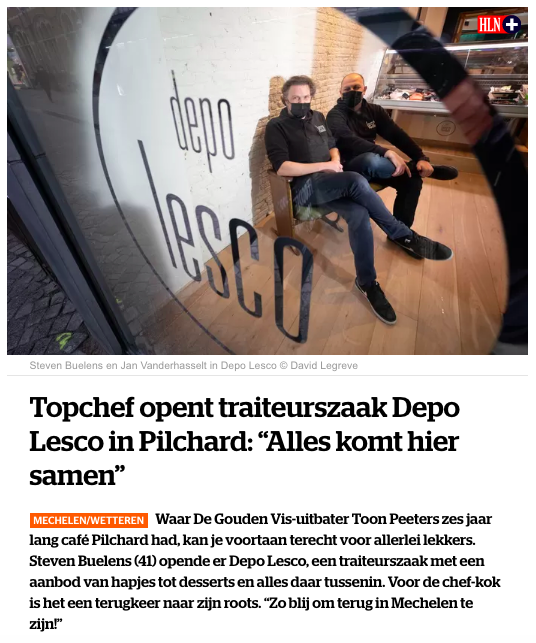 Artikel HLN online (https://www.hln.be/mechelen/topchef-opent-traiteurszaak-depo-lesco-in-pilchard-alles-komt-hier-samen~aaac37ec/)