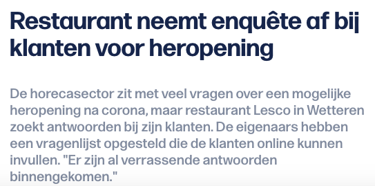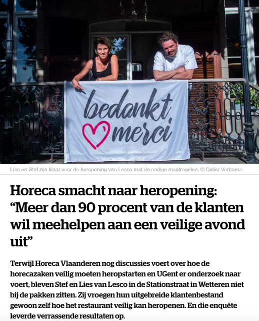 Artikel VRT online (https://www.vrt.be/vrtnws/nl/2020/05/28/restaurant-doet-enquete-bij-klanten-voor-heropening/)
